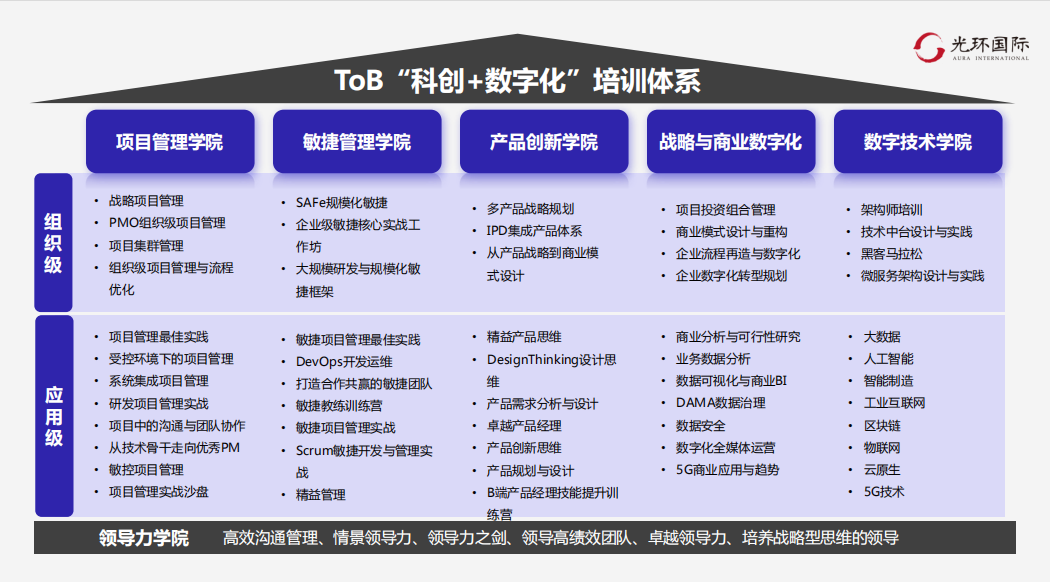 目前光環國際開設有6大產品系列,分別為項目管理、敏捷管理、產品經理、人工智能、數字化、國際學歷等。其中涵蓋18 款認證課程:PMP? / 軟考 / HCIA-PM華為項目管理 / PRINCE2 / PgMP / PfMP / MSP / P3O / NPDP / 數字化產品經理 / 數字化轉型規劃師 / PMI-ACP / DAMA / CDO首席數據官 / 機器學習 / 人工智能 / 人工智能訓練師 /數據分析等。以及5所國際學歷碩博項目,涵蓋計算機信息技術碩士、計算機科學碩士、MBA工商管理碩士、商業分析碩士、金融碩士、數據科學碩士、工商管理博士。 光環國際成立于2001年,創業之初就從美國硅谷引進先進的研發項目管理體系。二十多年來,不忘初心,以“科創者的終身學習伙伴”為目標,成為深耕“科創+數字化”領域的人才培養解決方案的領先品牌,是華為、阿里、騰訊等頭部企業的戰略伙伴。